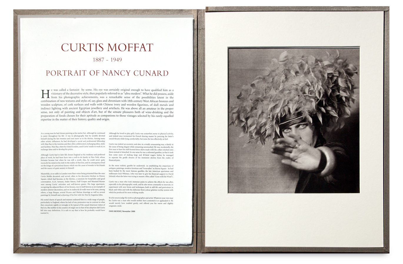 A Portfolio, each containing a Platinum Print of “Portrait of Nancy Cunard”. Each portfolio also contains an essay (part of which is quoted below) by Ivan Moffat and a facsimile of Nancy Cunard’s poem written for Curtis Moffat in 1923.
